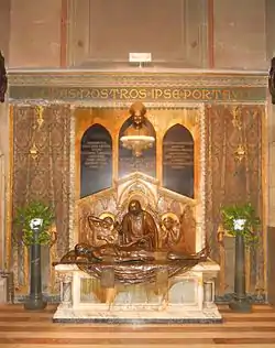 The central nave ends with a deep polygonal apse, enlightened by two orders of ogival windows; in the centre of the apse rises the marble high altar, decorated with gilded bronzes and surmounted by the tabernacle[31] Behind the altar there is the altar piece The Sacred Heart and the Souls of Purgatory, by Giuseppe and Alessandro Catani.[32]