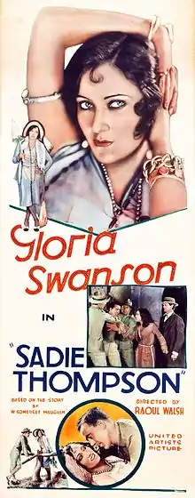 Sadie Thompson is a 1928 American silent drama film that tells the story of a "fallen woman" who comes to Pago Pago to start a new life, but encounters a zealous missionary who wants to force her back to her former life in San Francisco. The film stars Gloria Swanson, Lionel Barrymore, and Raoul Walsh, and it is one of Swanson's more successful films. Due to the public's apathy towards silent films, a sound version was prepared in the latter half of 1928. While the sound version has no audible dialog, it features a synchronized musical score with sound effects along with a theme song.