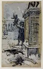 A very daring composition, this is one of Waterhouse's most unusual, and consequently most striking, oil paintings. The corpse is dramatically foreshortened, and the snow contrasts with that of Eulalia's naked flesh – the 12-year-old girl seems singularly out of place for a Waterhouse picture.[1] His choice of configuration – situating the corpse across the front and leaving so much of the central canvas unoccupied – was risky but it worked: by placing all the background figures in the distance, he concentrated the viewer's gaze on the naked body.[2] The nudity was also groundbreaking for Waterhouse – and something that could have laid him open to criticism – but his sensitive handling of the subject, the youth of the saint, and the historical context of the painting allowed him to escape the critics' pen.[3] The eye is also led to the murdered girl by the angle of the Roman guard's spear, pointing to the ropes that had bound her to the stake.