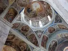 During the collapse in the 15th century the northern wall survived the best. All other walls were partially destroyed (the southern wall suffered the most of all), and, in particular, much of the stone carving from the exterior of the cathedral was torn in pieces. Although at the time the exterior stone carving were considered to be out-of-fashion, Yermolin during the restoration works made attempts to put the stories together. In particular, he was able to put together two stones with the Holy Trinity image in the south portal.[2] However, since there were panoramic images of the whole surface of the cathedral prior to the collapse, and many of the carved stones were destroyed, Yermolin was not able to identified all the stories, and put many stones in random order. Some of the stories were actually used for construction, and their carvings were buried inside the walls; other stones landed in neighboring farms. Some of the latter were later recovered by Pyotr Baranovsky during the Soviet times renovation. Currently, most of the original carvings have been reconstructed on paper.