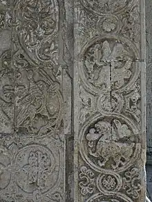 The stone carvings of the St. George Cathedral combine human and animal forms, performed as reliefs, with floral ornamental motives, carried out in the fine carving techniques. This combination has been known in frescoes of Saint Boris and Saint Gleb Church in Kideksha and of the Nativity Cathedral in Suzdal, however, for the sculpture, the combination is unique for Rus. It is thought that the stone carvings were done by two groups of artists. One, consisting of 12 artists, was doing the reliefs, whereas another group of 18-24 was working on the floral ornaments.[2]