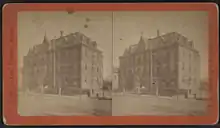 The original building was a converted residence containing 13 beds. By July 1869, 10 sisters were looking after 34 inpatient beds, with demand for more.[2] In 1869, the cornerstone was laid for a new building, designed by Jeremiah O'Rourke. The 3-story, 150 bed, red brick hospital, located on the corner of Central Ave. and Dr. Martin Luther King Jr. Blvd., was opened in 1871.[3][7] It was described in 1873 as "a bijou of a hospital, perfect in all its accommodations from cellar to attic, and it would be difficult to overpraise its administration and equipment."[2][8]