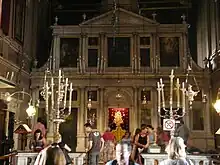 The front of the marble iconostasis resembles the exterior of the entrance of a baroque-style church. The ceiling of the church is divided into segments depicting scenes from St. Spyridon's life and miracles. The original painter of the church ceiling was Panagiotis Doxaras who created the works in 1727. With the passage of time the Doxaras paintings rotted away and subsequently they were replaced by copies painted by Nikolaos Aspiotis, a member of the Aspiotis family of Corfu.[2] The only remaining trace of Doxaras's work is the gilded border of the iconography.[4][5]