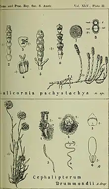 It grows as an erect or decumbent perennial herb with succulent, stem-like leaves, growing up to 0.8 m in height.[2] It is very similar to the better known beaded glasswort but is a larger plant and differs in having a thicker fruiting spike, 4โ€“9 mm in diameter, and seeds with blunt hairs or papillae.[3]
