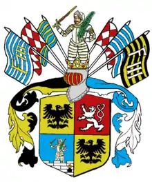 A shield quartered: first and fourth or, an eagle sable, red langued, facing centre; second gules, a lion passant forchée argent; third azure, mur argent masoned sable, thereon a knight affronté armed cap-à-pie argent bordé or, wearing helm ouvert, brandishing a sword ardent proper and in sinister hand a palm branch vert, to the left of him exploding grenade hitting the wall. Thereupon tilting helmet with mantling sable and or, and azure and argent; crest of knight rising from shield between six banners (3:3) on poles argent with points argent; dexter first barre argent and azure with text argent “F III,” dexter second lozengy gules and argent, dexter third barre or and azure; sinister first barre sable and or with text argent “F III,” sinister second barre azure and or, sinister third lozengy argent and gules.[6]