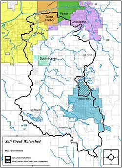 The Salt Creek watershed covers 19% of Porter County and 49,573 acres (20,061 ha), including the communities of Valparaiso, South Haven, Portage and Burns Harbor, Indiana.[4]