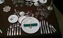 Salt cellars are known, in various forms, by assorted names including open salt, salt dip, standing salt, master salt, and salt dish. A master salt is the large receptacle from which the smaller, distributed, salt dishes are filled; according to fashion or custom it was lidded, or open, or covered with a cloth. A standing salt is a master salt, so-named because it remained in place as opposed to being passed.[4] A trencher salt is a small salt cellar located next to the trencher (i.e., place setting).[5] Open salt and salt dip refer to salt dishes that are uncovered.
