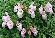 Salvia caespitosa is a herbaceous perennial native to rocky limestone and volcanic slopes, at 4600–7900 ft elevation, in central and southern Anatolia. It has been grown in horticulture since the 1950s, typically in rock gardens, due to its dwarf, mat-growing habit. Caespitosa refers to its habit of "growing in dense clumps or tufts", with divided leaves and stems that grow in bunches, rather than being evenly spaced. The pale pinkish lilac flowers, about 1.6 in long, grow on very short inflorescences that are barely longer than the leaf.[1]