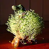During the 1980s in the United States, the first substantial wave of chia seed sales was tied to Chia Pets. These "pets" come in the form of clay figures that serve as a base for a sticky paste of chia seeds; the figures then are watered and the seeds sprout into a form suggesting a fur covering for the figure. About 500,000 Chia Pets a year are sold in the US as novelties or house plants.[20]
