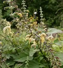 Salvia nubicola reaches 3 ft (0.91 m) high and wide, growing upright, with fresh-green colored leaves that are triangular shaped, with the largest, approximately 5 in (13 cm), growing at the base of the plant. The petiole is typically about the same length as the leaf blade. The plant puts out numerous 10 in (25 cm) long inflorescences holding pale yellow flowers, in whorls of two to six, that have finely spotted maroon markings on the upper lip.[2] The calyx is bright green, hairy, sticky, and glandular, giving off a medicinal odor when rubbed, described by one author as "resembling the distinct odour of a billy-goat," all of which cause animals to avoid it in its native habitat.[1]