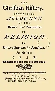 The first religious newspaper in the world, a weekly entitled The Christian History, was established by Reverend Thomas Prince, of Boston, whose son, Thomas Jr. was the editor who commissioned Kneeland & Green in 1743 to conduct its printing. In its time it received much criticism and was only published for two years, but it remained an authoritative account[lower-alpha 10] in many aspects thereafter.[31][32][33]