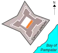 Pampatar, or Port Royal Mampatare, was founded in 1536 on the shore of the best protected deep water anchorage on the island.[1] The city was divided into two parts due to the irregular coastline.[2] The original castle was built over a period of about 20 years, started in 1622.[2] It was sited in the heart of the old city, looking out over the Bay of Pampatar. Its purpose, together with the La Caranta fort on the other side of the bay, was to protect the town from pirates with crossfire.[3]