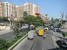 San Dionisio's transportation network consists of two national primary roads, one national secondary road and one expressway as of 2017.[13] The Manila–Cavite Expressway and Elpidio Quirino Avenue provide north–south connectivity, with the latter traversing the barangay's old section and the Kabihasnan commercial row along Victor Medina Street. The barangay's main east–west corridor is Dr. Santos Avenue which links its old section with the bigger commercial developments in its eastern sector, including the SM City Sucat shopping mall. In a bend of the avenue north of Victor Medina Streets starts Ninoy Aquino Avenue, a national secondary road that links the barangay to Ninoy Aquino International Airport as well as the popular Dampa, a collection of stalls and restaurants near the boundary with La Huerta that sell and cook fresh and locally-caught seafood.[14] A recent addition to the barangay's road network is the south extension of C-5 Road which opened a large tract of former idle lands south of the international airport in San Dionisio to vertical commercial and residential developments in 2007.