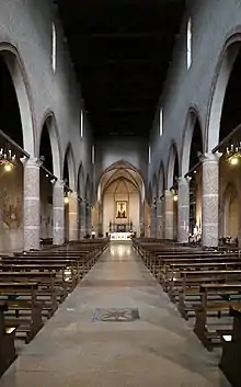 The church was founded by the Franciscan Order in 1304 but it was not consecrated until 1459, when Pope Pius II performed the ceremony.[1] Suppressed in 1782, it was sacked in 1797,[1] during the Napoleonic Wars, and turned into an arsenal in 1811. Still in military use when World War II began, it was devastated by bombardment during the war. The Cappella Gonzaga, with its frescoes depicting the life of St. Louis of Toulouse ( Italian: San Ludovico d'Angiò ), was saved and recently restored. These frescoes were supposed to have been painted by Serafino de' Serafini,[1] an artist who was active in Modena during the 14th Century. The church was reconstructed in Romanesque and Gothic styles. Now visible are some of the original frescoes depicting St. Francis Receives the Stigmata by Stefano da Verona. Andrea Mantegna's work St. Bernardino of Siena between Two Angels was originally here but it is now at the Pinacoteca di Brera in Milan, Italy.