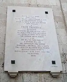 The plaque at the base of the bell-tower recalls a visit by St Francis to Sicily, but the fascist symbols and dating add a dissonant addition to a Franciscan church.[2]