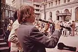 Nightclubs across the city increasingly featured jazz fusion artists who moved away from traditional jazz, embracing a range of influences including Brazilian musical forms; bongo playing for instance became one of the musical icons of the city during this period. Keystone Korner in North Beach was a notable jazz club which opened in 1972, featuring jazz greats like Miles Davis, McCoy Tyner, Betty Carter and others.[24] Another popular nightclub of the 1970s which opened in 1972 was Dave Allen's The Boarding House (nightclub), which hosted music and comedy, featuring Bette Midler, Patti Smith, Dolly Parton, Steve Martin, Robin Williams, and others.[25] In the 1970s, the rise of disco was one of the biggest musical genres of the decade (rooted in funk, Latin and soul vocal music supported by bass lines and electronic synthesizers). Disco took hold in the San Francisco gay community in the early 1970s and by 1978 the androgynous San Francisco singer Sylvester had achieved national prominence with several disco hits.[26]