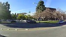 The Civic Plaza complex includes an underground parking garage for city officials, as well as a city-owned public parking garage one block to the north.[51] Unlike the Civic Center city hall, the current city hall lacks direct access to freeways. The Santa Clara Valley Transportation Authority's Santa Clara light rail station is located two blocks to the west.
