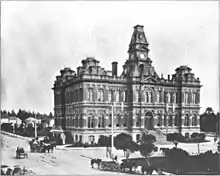 On August 14, 1854, a city committee called for proposals to build a permanent city hall. On October 16, voters approved a $20,000 budget for the new building (equivalent to $514,161 in 2022). The city purchased a site on North Market Street.[22] Levi Goodrich designed the two-story building, which measured 55 by 40 feet (17 m × 12 m). The Common Council (as the city council was then called) met there for the first time on April 16, 1855.[23] Originally, the building had a Gothic façade and parapet. Around 1870, it was rebuilt with a Greek exterior.[15][24] The Santa Clara County superior court rented the second floor from September 1, 1860,[25] until a new courthouse was built at St. James Square.[26] The building was destroyed in the 1906 San Francisco earthquake.[27] The San Jose Fire Department's Torrent Engine Company #2 was stationed at this site from 1869 to 1951, when the Central Fire Station opened.[28]