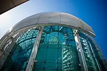 • The freestanding rotunda rises 110 feet (34 m) above the center of the plaza,[10] resembling a planetarium.[7] It has a diameter of 100 feet (30 m), slightly wider than the United States Capitol rotunda. The entire exterior is a glass curtain wall, supported by tension cables and structural steel beams.[11] Mayor Ron Gonzales and other city officials insisted on a rotunda to evoke classical civic buildings. It was originally conceived as a public entrance to symbolize open government. However, by 2015, the 9,427 square feet (875.8 m2) space had become a ceremonial entrance, usually closed off to the public but rented out for city and private events about 150 times a year.[1][7][10]