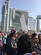 The front plaza facing East Santa Clara Street was designed as a public square. It regularly attracts political demonstrations. In 2007 and 2008, it was the site of protests and a hunger strike by Lý Tống regarding city council's initial refusal to name the city's main Vietnamese business district Little Saigon.[1][69] Local versions of national rallies have been held at City Hall, including an immigration reform protest in 2006; Occupy San José in 2011; Not My Presidents Day, the Tax March, the March for Science, and the Women's March in 2017; March for Our Lives and Families Belong Together in 2018; and the George Floyd protest in 2020. The previous city hall also attracted political demonstrations, including marches following the police shooting deaths of John Henry Smith in 1971[70] and Bich Cau Thi Tran in 2003.[71] The plaza also hosts vigils, such as one for victims of the 2021 VTA rail yard shooting.[72]