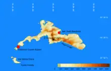 There is a short, 885 m (2,904 ft) airstrip at Robinson Crusoe Airfield in the southwestern end of the Robinson Crusoe Island, the only reasonably flat part of the island. Operations are mostly in twin-engine, seven-seat light planes, with very limited baggage capabilities. The flight time from the mainland of Chile is about 2 hours 30 minutes, plus a 1-hour 30 minute boat ferry to the village at the opposite side of the island.[2]