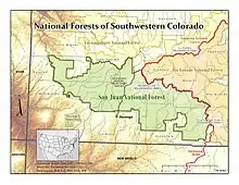 The San Juan National Forest is a U.S. National Forest covering over 1,878,846 acres (2,935.7 sq mi, or 7,603.42 km²) in western Colorado. The forest occupies land in Archuleta, Conejos, Dolores, Hinsdale, La Plata, Mineral, Montezuma, Rio Grande, San Miguel and San Juan Counties.[1] It borders the Uncompahgre National Forest to the north and the Rio Grande National Forest to the east. The forest covers most of the southern portion of the San Juan Mountains west of the Continental Divide. The forest contains two alpine wilderness areas; the Weminuche and South San Juan, as well as the Piedra Area. The Durango and Silverton Narrow Gauge Railroad passes through the National Forest.