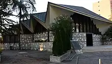 In its architecture, the church was conceived as a 'tent church'.[19] It features twelve stained glass windows, created between 1986 and 1992, which illustrate the seven sacraments, the birth of the Church, and Christ's incarnation, passion, death and resurrection. The current presbytery was added between 1999 and 2000.[7]