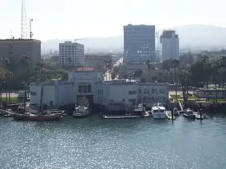 The Municipal Ferry Building was built in 1941 as a Works Project Administration (WPA) project, built at Berth 84.[3] It was designed in the Streamline Moderne style by architect Derwood Lydell Irvin of the Los Angeles Harbor Department.[6] It has a five-story octagonal clock tower.[3] Its "sister ferry terminal" was across the main channel at Berth 234, also Irvin designed in the Streamline Moderne and built by the WPA in 1941.[7]