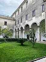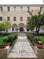 The main facade is elevated compared to the current road level and encompasses a two-storey central body with an arched portal. At the ends of the main facade, an additional floor exists that corresponds with the lateral bodies of the complex. The ground floor is characterized by a covered porch with groin vaults, supported by round arches with stone archivolts, upheld by square pillars.[17]