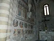 • Transept right of the apse chapel (Lionella Chapel): It has a cycle of frescoes dating depicting Stories of St. Martin (1355-1360). The chapel also has sculptures in marble, representing two arms of which one of the family Lionella and the other, the family Petra (whose chapel is located inside the church, to the left of the apse), depicting a lion rampant holding a stone in one paw and a severed head in the other.
