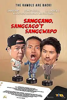 Sanggano, Sanggago’t Sanggwapo (transl.The Thug, the Bonehead 'n' the Good-Looking) is a 2019 Philippine comedy film directed by Al Tantay, and starring Andrew E., Dennis Padilla, Janno Gibbs, Eddie Garcia (in his final appearance), and Louise delos Reyes.[1][2] It is about three troublesome friends who learn that one of them has inherited a hacienda from a deceased, rich man alleged to be his father. The film was released in the Philippines on September 4, 2019.[3] It is also a sequel of Sanggano't Sanggago way back in 2001 starring Bayani Agbayani and Eddie Garcia.