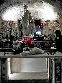 The interior of the church contains a silver chest with her relics, and lava slabs putatively with imprints of her small feet. A placard at the entrance to the prison explains that she stood here, before pushed into her prison cell. The crypt-like putative prison-cell houses a marble statue of a triumphant and healed Agatha. The main altarpiece is a depiction of the Martyrdom of Saint Agatha by “Bernardino Niger grecus” (1588). The painting depicts the Ancient Roman amphitheater in Catania behind the saint, part of which has been uncovered in Piazza Stesicoro in front of the facade of the adjacent Sant'Agata alla Fornace. [1] A bejeweled half-bust of a plump Agatha, kept in this church is paraded across the city in procession during the Festival of Saint Agatha every February 3-5.