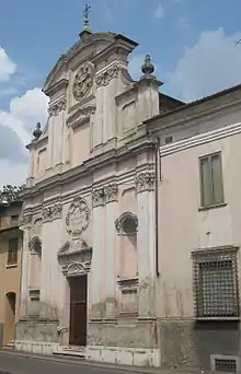 The church of Sant'Egidio is located in the historic center of Mantua on Via Pietro Frattini. A church was located on the site likely by the 9th century, but is documented from the year 1151 in a bull by Pope Eugenius III . In 1540, the chapel of the Valenti was built, commissioned by the last will of Valente Valenti, courtier in the Gonzaga Duchy. Beginning in 1721, the church underwent a major reconstruction, and the present facade dates to that time. In 1777, the cardinal Luigi Valenti reconstructed the family chapel.