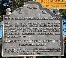 The registration for the Women's Club Adobe Plaque as a California Historical Landmark #249 dates back to September 3, 1937.[1] On January 20, 1961, the California State Parks Commission in cooperation with the Santa Clara Women's Club, erected a commemorative plaque, that designates the site of the Women's Club Adobe. The marker is located at 3260 The Alameda between Benton and Franklin Streets, Santa Clara, California. The inscription on the plaque reads: "This adobe, among the oldest in Santa Clara Valley, was one of several continuous rows of homes built in 1792–1800 as dwellings for the indian families of Mission Santa Clara. It links the Franciscan padres’ labors with California of today."[1]