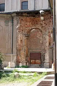Only some scattered ruins to the right of the church remain of the shrine today, which were restored as part of a three-year project, which was completed in November 2015. During the renovation of the street Via Santa Maria alla Porta, the original marble floor was also found, but it was covered again for the lack of necessary funds.[9] The fresco, Madonna del Grembiule or Madonna dei Miracoli was also discovered, which was previously protected by a wooden display case, but today was restored and given back at the devotion of parishioners.[10] However, an engraving by Marc'Antonio Dal Re (1697-1766) and some rare photographs clearly show the structure that was later destroyed.[11]