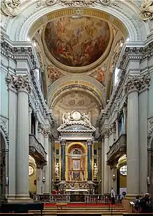 The construction of the present Baroque church began in 1687-1690 under the designs of Giovanni Battista Bergonzoni, who built the elliptical plan with a dome designed by Giuseppe Tubertini, completed in 1787.[1] The facade was not added till 1905. The sanctuary houses the sculptural group of Sorrow over Dead Christ (1463) by Niccolò dell'Arca.