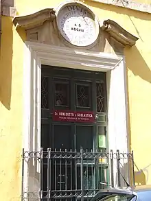 The church is part of a larger building, and hence has no separate architectural identity. It is marked by the interesting and unusual dedicatory inscription over the entrance, which is written in concentric circles within a tondo. This tondo is flanked by two diagonal strips of cornice each with a faint S-curve, and which join to it via tiny volutes. The inscription reads "Divis Benedicto et Scholasticae Patronis nursinus ordo et populus", which translates as "To the honoured patrons Benedict and Scholastica, the council and people of Norcia".