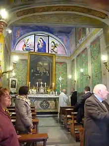 The single-roomed interior was entirely restored in the 19th century, and could be described as garish in places. The walls are painted to imitate green hanging curtains, with trompe-l'œil pilasters supporting an entablature with an inscription "Felix Nursiae tellus quae talem genuit alumnum" or "Happy land of Norcia, which gave birth to such a pupil". There is a painting of the patrons over the altar, and over that a lunette containing stained glass showing the Madonna and Child being venerated by saints. The Baroque altar has polychrome marble inlay.