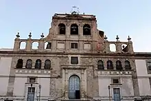 The present church was built after the 1693 Sicily earthquake inserted into the ruins of the 16th-century palace of La Palumba,[1][2] which then became a Clarissan order monastery.[3] The design is attributed to Vincenzo Vella.[1] The facade interrupts the palace front and is topped by a sail-like bell tower. The portal is accessed through a brief double staircase. The second story has a row of windows with metal grills used by the cloistered nuns to look out on the piazza in front of the church.[1]