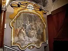 Inside there are three chapels. The largest one is dominated by a small dome frescoed by Filippo Tancredi. The frescoes on the walls of the entrance staircase depict the Miracle of the Healing of the Child by St Basil and St Basil preaching, painted by Vito D'Anna. In the apse is a large marble group representing the Crucified Christ between the Archangel Michael, Saint Cajetan, and Saint Mary Magdalene. Overlooking the present presbytery is a 1725 painting by Cedri depicting the Coronation of Santa Rosalia; it was formerly housed in the nearby Benedictine Monastery of Santa Rosalia, which was razed in the 20th century to expand the Via Roma.[1]