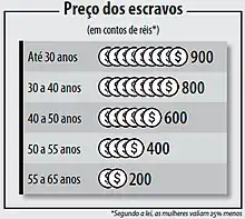 The adoption of the Sexagenarian Law produced few practical effects since only a minority of Brazilian slaves were over 60 years old.[1][20] In 1872, the life expectancy of the general population was 27.4 years, while that of the slaves was 21 years.[21] In 1887, out of a total of 723 thousand slaves, only 28.8 thousand were over 55 years old.[22] Furthermore, the amount paid for slaves was higher for the younger ones, varying from 900 contos de réis (for slaves up to 30 years old) to 200 (for those between 55 and 65).[2]