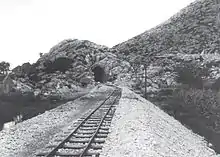 The first measurements began in 1879, and in the summer of 1884, the construction of the first section from Metković to Mostar began, for which all the material was brought via the port in Metković.[11] The most difficult part of this section was from Buna to Čapljina, a length of 19-kilometre (12-mile), because it passed through the Neretva canyon, which was difficult to access, so an auxiliary road was also built for construction purposes. From Gabela to Metković, due to the flooding of the Neretva, the railway was built on an embankment. In this section, the width of the upper embankment was 3 metres (9.8 ft). The rails weighed 17.8 kg per meter in length and the tunnels were built with a width of 3.3 metres (11 ft) and a height of 3.1 metres (10 ft). The capacity of the section was 30 trains in 24 hours, and the maximum speed was up to 18 km/h. Although this speed corresponded to a minimum radius of 71 metres (233 ft), the built minimum radius was 100 metres (330 ft).[12]