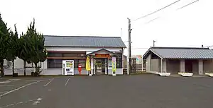 The station consists of dual opposed side platforms connected by a footbridge to a wooden, single-story station building. The station is staffed.