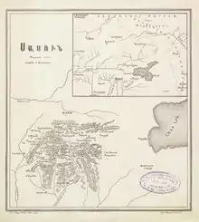 Within the Kingdom of Armenia, Sanasun or Sasun bordered the districts of Hashteankʻ of Tsopʻkʻ province to the northwest, Tarōn, Aspakuneatsʻ Dzor and Khoytʻ (Khutʻ) of Turuberan province to the northeast, and Salnoy Dzor, Gzekh, Aghdzn, and Npʻrkert of Aghdznik province to the east and southeast.[9] Suren Yeremian estimates the area of historical Sanasun at 2,400 km2 (930 sq mi).[12] In later periods, Sasun referred to a broader geographical, economic and political region which included historical Sanasun and the adjacent territories, and was considered a part of the region of Taron-Turuberan.[10][13] By one definition, Sasun encompassed the area between the Haçres and Sim/Kurtik Mountains in the north to Sasun village (modern Derince, Sason) in the south and between Kulp in the west and Kavakbaşı (historical Khoytʻ) in the east.[1] After the creation of the Bitlis vilayet in 1875, most of Sasun was made part of the sanjak of Mush of the Bitlis vilayet and called the kaza of Sasun, with other parts of the greater region of Sasun falling under adjacent sanjaks.[14][lower-alpha 3] Little is known for certain about Sasun's internal sub-divisions during the late Ottoman period, and these seem to have changed frequently.[16] One source gives the names of the sub-districts (or nahiye) of Sasun in the late 18th and early 19th centuries as Brnashēn, Bun Sasun ("Sasun proper"), Kharzan, Khutʻ-Brnashēn, Khulpʻ, Hazzo-Khabljoz, Motkan, Shatakh, Talvorik (Talori), and Pʻsankʻ․[16]