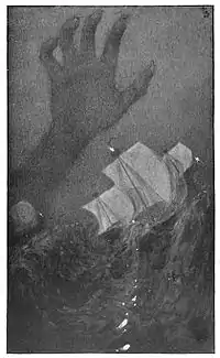 Andrea Bianco's 1436 long label Ya de la man santanaxio provoked Vicenzo Formaleoni (1783) to read it as the isle of "the Hand of Satan", an alternative name for Satanazes still found in some sources.[12] Formaleoni proposed it might be connected to a legend from India, about a giant hand that arose each day from the sea and carried off the inhabitants into the ocean. This legend is told in the Perigrinaggio di tre giovani (The Three Princes of Serendip) first published in Venice in 1557 by Michele Tramezzino (alleged to be a translation from the Persian of a certain Christopher of Armenia, Christoforo Armeno). The story might have been circulating earlier among Atlantic Ocean seafarers, traced in Irish immrama and Arab tales, about a giant hand in the Sea of Darkness that plucked sailors and sometimes entire boats, and dragged them to the bottom of the ocean.[13] Gaffarel suggests this might be a reference to the icebergs of the North Atlantic Ocean.[14]