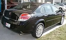 The Aura XR was the top-line Aura model. The XR was fitted with the 3.6 L DOHC V6 with VVT, rated at 252 hp (188 kW) at 6200 rpm and 251 lb⋅ft (340 N⋅m) of torque at 3100 rpm. This engine was first used in the Cadillac CTS as well as the Cadillac STS and marks its third use in a North American GM car. With this 3.6 L engine, the Aura was the first front-wheel drive GM passenger car to use the new Hydra-Matic 6T70 six-speed automatic transmission.[14] The transmission featured TAPshift, which allowed the driver to manually select gears by using paddles located behind the steering wheel.[15] The Aura XR was the performance-oriented version with a taut, but not harsh, suspension and the more powerful engine. Available interior colors in the XR were tan and grey leather (available in the XE), along with the XR-specific black or Morocco Brown leather. Cloth was standard. Other standard features included the Advanced Audio Package, 18 inch alloy wheels, chrome exterior door handles, and remote vehicle start.[16] Given the 2007 Saturn Aura's European roots—the car's chassis was also used for the Saab 9-3. The Aura also used hydraulic power steering (V-6 models only) that provided more feedback and a more linear feel than the fussy electric power-assist units. For 2009, an entry level XR became available. It included the 17 inch 10 spoke alloy wheels available on the XE and the 2.4 L LE5 Ecotec engine mated to GM's all new 6T40 6-speed automatic transmission with TAPshift. The 3.6L VVT with 18" wheels was optional.