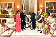 First Lady Kovind with President Ram Nath Kovind host a state dinner for Donald Trump, Melania Trump and Narendra Modi at the Rashtrapati Bhavan.