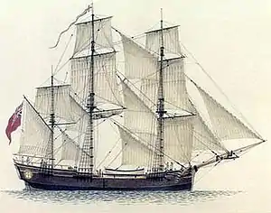 Scarborough's crew as a convict transport was approximately 35 men including her master, three mates, a boatswain and a ship's surgeon.[12]