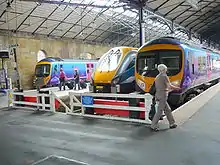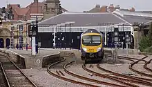 Scarborough, formerly Scarborough Central, is a Grade II listed[1] railway station serving the seaside town of Scarborough, North Yorkshire. It lies 42 miles (68 km) east of York and is one of the eastern termini on the North TransPennine route; it is managed by TransPennine Express.[2] The station is also at the northern end of the Yorkshire Coast line and is reputed to have the longest station seat in the world at 456-foot (139 m).[3]