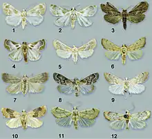 Adults of Schacontia: 1=S. medalba, 2=S. chanesalis, 3=S. umbra, 4=S. speciosa, 5=S. ysticalis, 6=S. themis, 7=S. rasa, 8=S. nyx, 9=S. clotho, 10 & 11=S. lachesis, 12=S. atropos